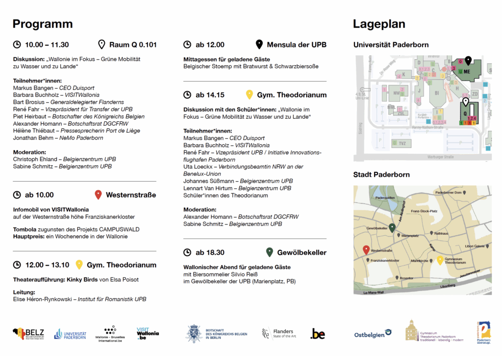 Der Themenschwerpunkt in diesem Jahr war der Wallonie gewidmet.  Unter dem Titel „Wallonie im Fokus – Grüne Mobilität zu Wasser und zu Lande“ fand am Vormittag eine interdisziplinäre Diskussionsrunde zu nachhaltiger Mobilität von Personen und Waren und der Bedeutung grüner Energieträger in der Wallonie statt. Eine anregende Diskussion mit dem Publikum führten S.E. Botschafter Heirbaut, Bart Brosius, Generaldelegierter Flanderns, Markus Bangen, CEO des Duisport, Hélène Thiébaut, Pressesprecherin des Hafens Lüttich, Prof. Dr. René Fahr, Vizepräsident der Universität Paderborn, Barbara Buchholz, VISITWallonia, Jonathan Behm, NeMo Paderborn, Mathieu Quintyn (Wissenschaftsberater Wallonie-Bruxelles International) und Yves Dubus (Wirtschafts- und Handelsattaché der Wallonischen Investitions- und Exportförderungsagentur Köln). Sie machten deutlich, welche Potenziale und Synergien durch eine gemeinsame Bearbeitung dieser Themen zwischen der Wallonie, Deutschland und insbesondere Nordrhein-Westfalen entstehen. Eine wertvolle, vieldiskutierte lokale Perspektive brachte Bürgermeister Dreier, Stadt Paderborn, in die Diskussion ein. Moderiert wurde diese Veranstaltung von Prof. Sabine Schmitz und Prof. Christoph Ehland vom Belgienzentrum.