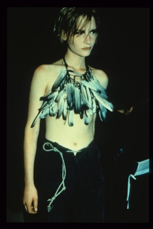 Ann Demeulemeester arbeitete von Anfang an eng mit ihrem Partner und Fotografen Patrick Robyn zusammen und erschuf ein hoch photographisches, poetisches Frauenbild. In ihrem Universum gleiten die Grenzen des binären Gender Dresscodes ineinander.[29] Inspiriert von der Punk- und Rock ’n‘ Roll-Szene, waren Demeulemeesters Kollektionen stets von Wildheit, freiem Geist und Rebellion geprägt. (vgl. Bild 2) Der häufige Gebrauch von Tauben- und Hahnenfedern repräsentiert eben jene beflügelten Freiheitsgedanken.[30] Auf ihrer Suche nach dem perfekten Schnitt kreierte sie geschickt konstruierte Kleidungsstücke, die sich durch eine anmutende Dynamik auszeichnen.