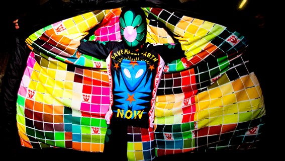 Walter van Beirendonck, der heute die Modeabteilung der Akademie leitet, überzeugt durch schrille Farben und Prints voller künstlerischer und popkultureller Referenzen. (vgl. Bild 3) Er arbeitet bevorzugt mit Selbstinszenierungen sowie provokanten Details und interessierte sich bereits während seiner Studienjahre für gesellschaftliche Themen und Kunst.[33] In den 1990ern erreichte er durch eine Männerkollektion für verschiedene Körpertypen seinen Durchbruch und ging eine Partnerschaft mit Mustang unter dem Wild & Lethal Trash-Label ein. Seine Modenschauen zeichneten sich durch faszinierende Performances aus, die künstlerische Statements mit expliziten Silhouetten und Hightech-Materialien verbinden. Bis heute beschäftigt er sich mit Männerbekleidung, die sowohl Gendernormen sprengt als auch soziale Themen fokussiert.[34]