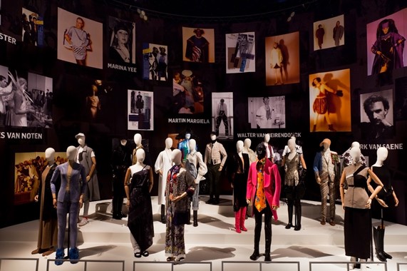 Was den Ort als Komponente der Lehrmethodik anbelangt, so befindet sich dieser, wie zu Beginn erwähnt, im künstlerisch-kulturellen Zentrum Südantwerpens, welches zahlreiche Kurations- und Inspirationsmöglichkeiten birgt, wie beispielsweise das ModeMuseum Antwerpen (MoMu), das Handelsmuseum oder das Royal Museum of Fine Arts. Das MoMu wurde 2002 mit dem Ziel der Sammlung, der Konservierung, der Ausstellung und des Studiums explizit belgischer Mode gegründet. Das Museum fokussiert dabei maßgeblich gegenwärtige belgische Mode und widmet sich vor allem den berühmten Modedesignern Antwerpens, die in den 80er und 90er Jahren zunehmend an Bekanntheit gewannen, wie Martin Margiela, Dries Van Noten, Ann Demeulemeester, Walter Van Beirendonck, Dirk Van Saene, A.F. Vandevorst etc. Die erste Direktorin des Museums war ebenfalls Linda Loppa. Anlässlich des 50. Geburtstages des Fashion Departments organisierte das MoMu vom 08.09.2013 bis zum 16.02.2014 eine Ausstellung mit dem Titel „Happy Birthday Dear Academie!“, die die Werke der berühmtesten Designer der Modeschule präsentierte. Darunter wurde ein Raum den „Antwerp 6+1“ gewidmet, in dem sich Studienarbeiten und frühe Werke zu Karrierebeginn der sieben Designer befanden. (vgl. Bild 4) Die Ausstellung wurde dabei sogar von Walter van Beirendonck persönlich, sowie von Kaat Debo, Karen Van Godtsenhoven und Geert Bruloot kuratiert.[46] Das MoMu zeichnet sich dabei durch erneuerte Themenausstellungen mit Modebezug aus, wobei der Ausstellungsraum stets mit den ausgestellten Exponaten korreliert und an diese angepasst wird.[47] Die immersive Szenografie ist dabei charakteristisch für die Ausstellungen, die den Rezipienten so in das Designgeschehen einspannen und dabei eine Kultivierung sowie Demokratisierung belgischer Mode mit der Absicht einer Zugangserleichterung bewirken.[48] Ziel des Modemuseums ist dabei, die Bedeutung des Terminus „Mode“ und das kanonisierte Narrativ, in das er eingebettet ist, zu reflektieren und kritisch zu hinterfragen. Es ist ein Ort, in dem jeder die Mode für sich entdecken kann und sich ihrer Vergangenheit, ihrer Gegenwart und ihrer Einflüsse auf die Zukunft bewusstwerden kann. Das MoMu beherbergt dabei die umfangreichste Sammlung belgischer Mode weltweit und ist für seine immersiven Ausstellungen berühmt.[49]