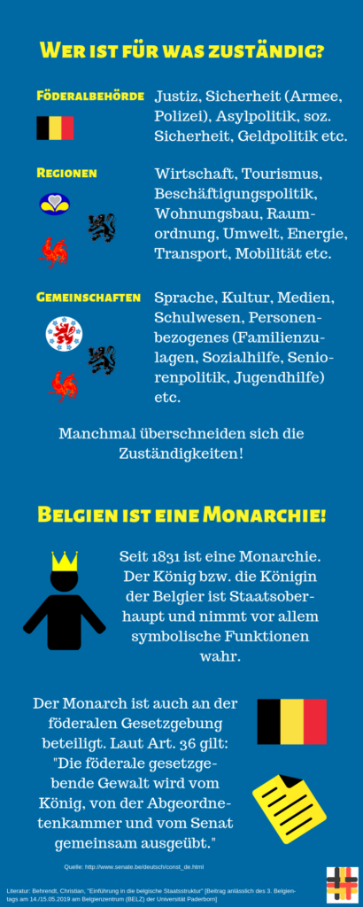 Im Gegensatz zur Situation in der Bundesrepublik Deutschland verfügt in Belgien die Föderalbehörde über alle Zuständigkeiten, die nicht explizit den Teilstaaten zugetragen wurden (Residualbefugnis)[16].