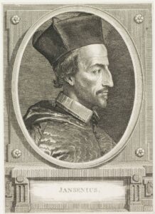 Der Jansenismus entstand in der ersten Hälfte des 17. Jahrhunderts und sollte mehr als ein Jahrhundertlang vor allem in Frankreich, den südlichen und nördlichen Niederlanden sowie in Italien Anklang finden.[10] Benannt wurden die Anhänger der Bewegung nach dem Theologen Cornelius Jansen, genannt „Jansenius“, von 1635 bis 1638 Bischof von Ypern. Dieser Namen wurde ihnen pejorativ von ihren Gegnern aufgezwungen, da sich die Anhänger keineswegs als Abspaltung der katholischen Kirche betrachteten, sondern diese durch ihr Gedankengut zurück zu ihren Wurzeln bewegen wollten. Insofern es sich um eine Reformbewegung handelte, wollte diese sich nämlich nie außerhalb der römisch-katholischen Kirche stellen, sondern sie hin zu einer strengeren Religiosität erneuern.[11] Jansenius‘ posthum veröffentlichtes Werk Augustinus (1640) bildete die Basis hierfür.[12] Jansenius hatte an der Universität Löwen im studiert, wo er die Lehren des katholischen Theologen Michel Baius kennengelernt hatte, dessen Kerngedanken über die Natur des Menschen und die Gnade Gottes wiederum stark durch die Rezeption des Kirchenvaters Augustinus geprägt worden waren.[13] Die Hauptanregung für seine Überlegungen über die Gnade war jedoch eine Diskussion hierüber zwischen so genannten Molinisten, Thomisten und zwischen Jesuiten und Dominikaner in Rom, die er während seines Studiums aufmerksam verfolgt hatte.[14] Jansenius interpretierte Augustinus‘ Lehren dahingehend, dass der menschliche Willen grundsätzlich unfrei und völlig abhängig von der göttlichen Gnade sei. Demnach könne der Mensch ohne diese Gnade einerseits nichts Gutes in der Welt verrichten und andererseits keine Erlösung finden. Weitere Glaubensgrundsätze waren unter anderem die Prädestination, die allein von Gottes Willen abhängig sei, eine vollständige Unterwerfung des Menschen im pietistischen Sinne sowie eine streng asketische Lebensführung, die als Gegensatz zur Haltung der Jesuiten angesehen wurde.[15]