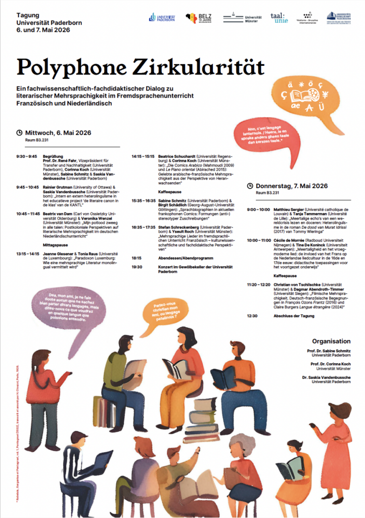 Am 06.05.2026 und 07.05.2026 findet an der Universität Paderborn die Tagung „Polyphone Zirkularität:Ein fachwissenschaftlich-fachdidaktischer Dialog zu literarischer Mehrsprachigkeit im Fremdsprachenunterricht Französisch und Niederländisch“. Sie bietet eine spannende Gelegenheit, den fachwissenschaftlich-fachdidaktischen Dialog zu ästhetisch-literarischem Lesen, Lernen und Lehren in den modernen Fremdsprachen Französisch und Niederländisch zu vertiefen