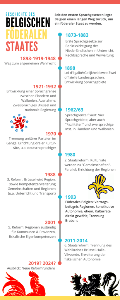 Diese Infografik bietet einen Überblick über die schrittweise Genese und Entwicklung des föderalen Systems in Belgien, aufgrund dessen die Regionen und Gemeinschaften weitreichende Kompetenzen aufweisen.